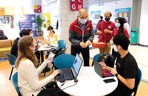 | Professor Raymond CHAN, Vice-President (Student Affairs), and Caring Leaders cheering up students by distributing the miniature mascots and drinks. |