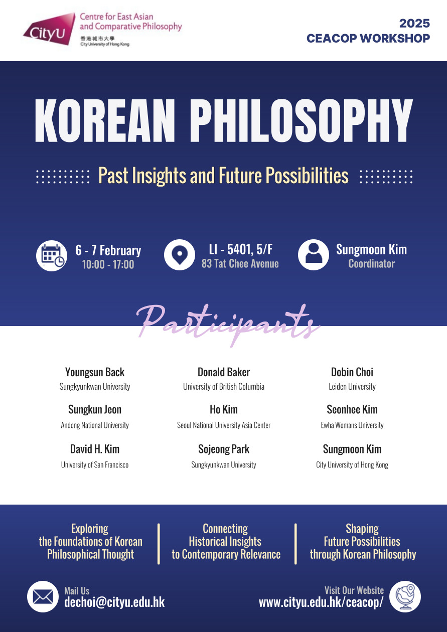Center for East Asian and Comparative Philosophy (CEACOP), Rm 5522, Li Dak Sum Building, 83 Tat Chee Avenue, Kowloon Tong, City University of Hong Kong, Hong Kong, ???(click)