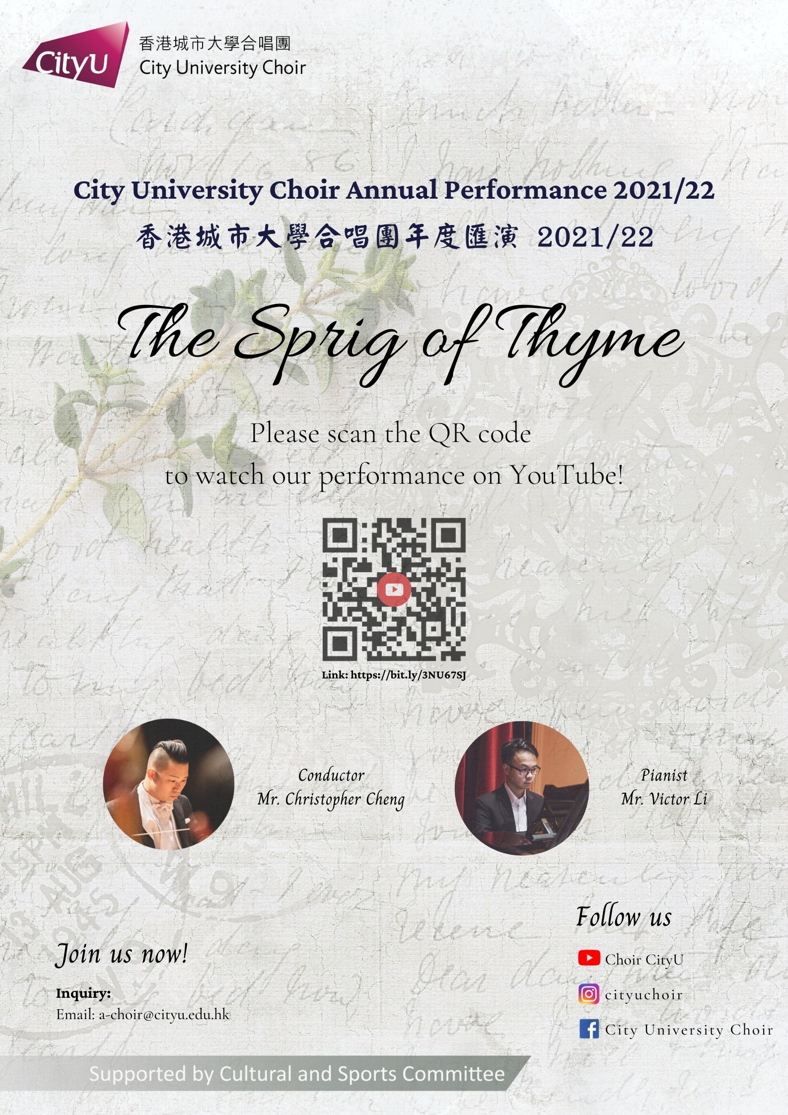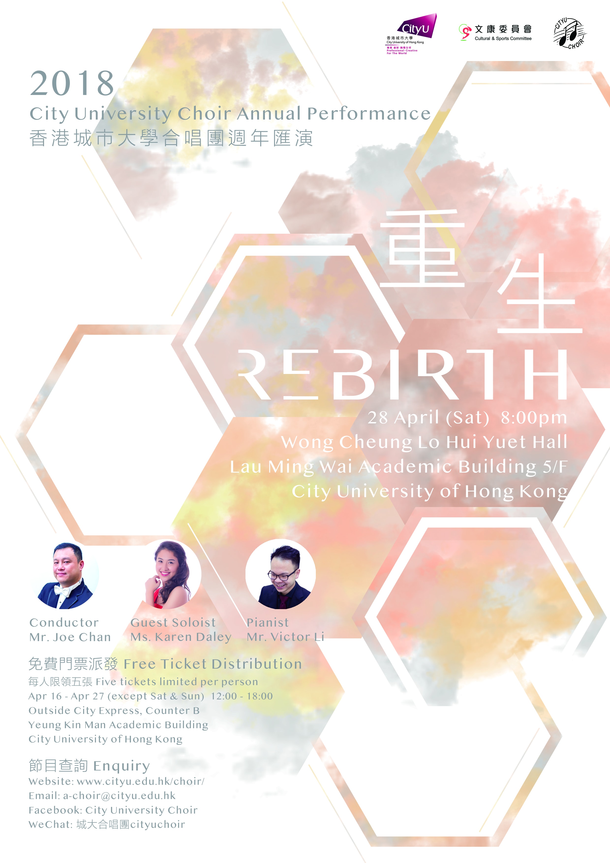 Every year, City University of Hong Kong Choir will present a variety of performances. Clicking the posters would access the e-booklet or the video of the past performances.