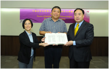 | Judge Xu Qingyu, Director of Politician Affairs Section, Jiangsu Province Higher People's Court presented a set of “Judgment in the Republic of China period” on behalf of the JSD students, accepted by Professor CHING Hsianghoo Steve, University Librarian, City University of Hong Kong. |