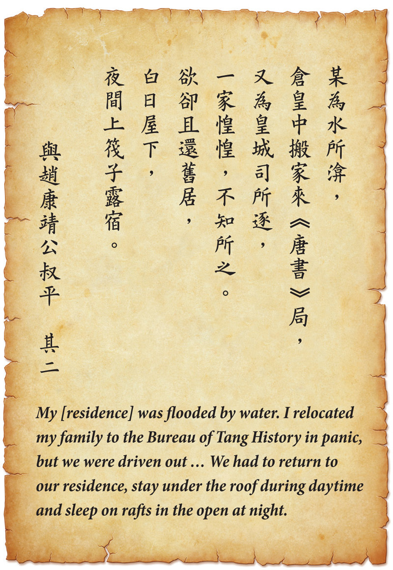 For example, Ouyang wrote a letter in 1056 recounting his unfortunate experience during a serious flood: “My [residence] was flooded by water. I relocated my family to the Bureau of Tang History in panic, but we were driven out. We had to return to our residence, stay under the roof during daytime and sleep on rafts in the open at night.” In other letters and poems, he reported several incidents of floods that trapped him in his leaking house, and the challenging conditions he faced in other weather hazards such as heavy snow and heatwaves.