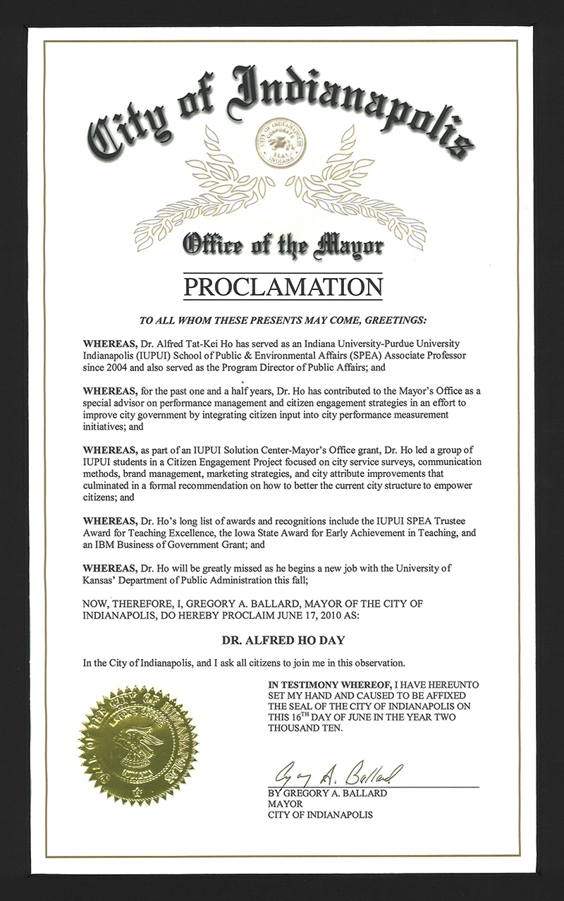 The US experience provided Ho many opportunities to develop his professional and academic career. After all, his work in America earned him teaching awards at all the academic institutions he has taught; a Best Paper Award by the American Review of Public Administration in 2015; and the Leslie A Whittington Excellence in Teaching Award in 2018 by the Network of Schools of Public Policy, Affairs, and Administration, a key international accreditation authority of public affairs programmes around the world. The day 17 June 2010 was even declared as the “Dr Alfred Ho Day” by the City of Indianapolis for his contribution to the city’s performance management and citizen engagement efforts.