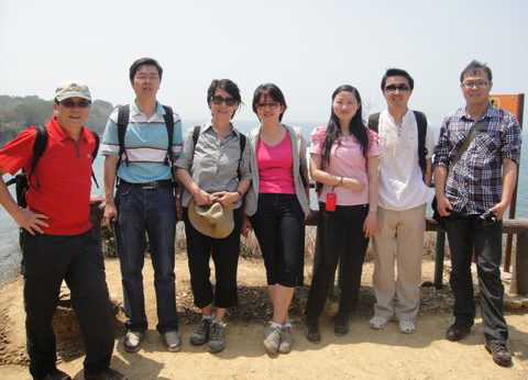 2011年第2期多友游東坪洲。右起:汪凱(浙大)、沈國麟(復旦)、吳來安(安徽師大)、王辰瑤(北大)、顏嘉琪、郭小平(華中科大)、李金銓。