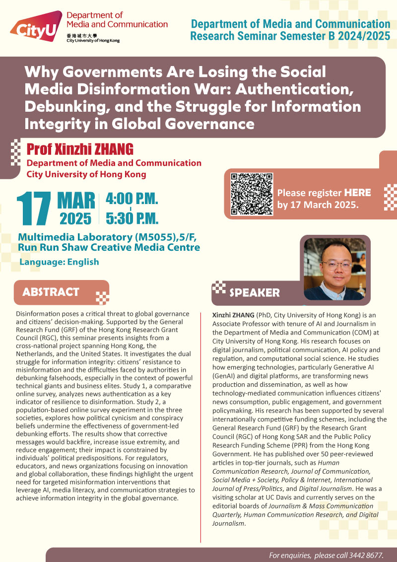 COM Research Seminar: Why Governments Are Losing the Social Media Disinformation War: Authentication, Debunking, and the Struggle for Information Integrity in Global Governance