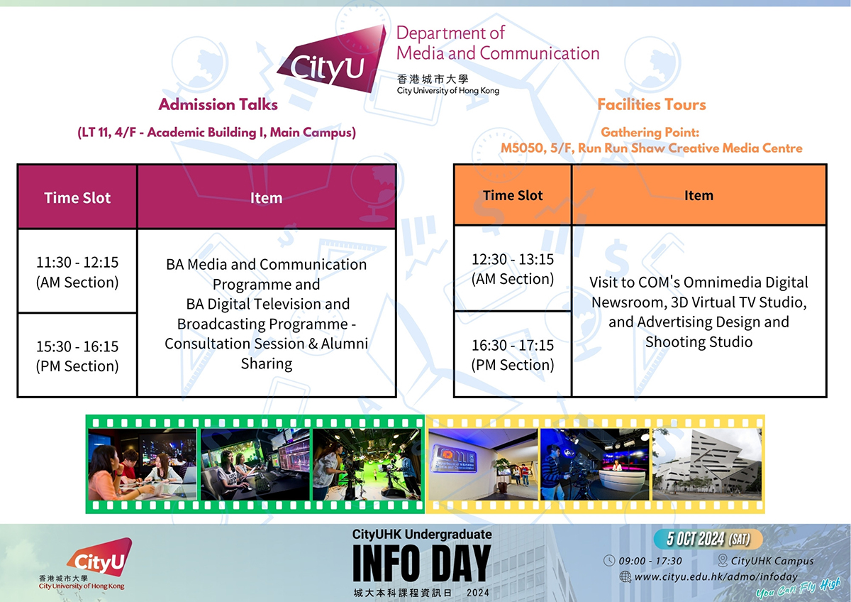 Join us at the CityUHK Undergraduate Information Day on 5 October 2024 (Saturday), from 9:00 a.m. to 5:30 p.m. The Department of Media and Communication (COM) will share the latest admission information and course structure during our Consultation Session and Alumni Sharing.