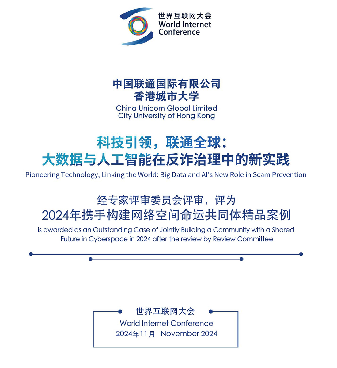 State Council Vice Premier Ding Xuexiang (國家副總理丁薛祥) attended this year’s Summit and delivered a keynote speech. During the event, the organizing committee announced this year’s Outstanding Cases of Jointly Building a Community with a Shared Future in Cyberspace, and China Unicom and CityUHK’s collaborative project “Pioneering Technology, Linking the World: Big Data and AI’s New Role in Scam Prevention” was recognized as one of the thirteen.