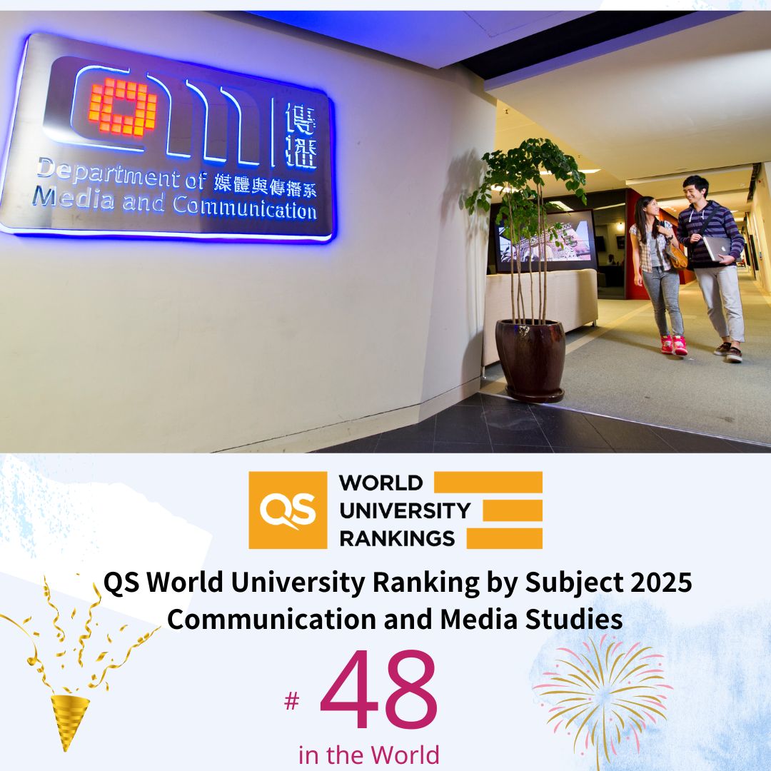 The Department of Media and Communication (COM) at City University of Hong Kong has reached a remarkable milestone, attaining an impressive 48th place globally in the QS World University Rankings by Subject 2025 for Communication and Media Studies. This achievement underscores the department’s continued upward momentum and marks a significant breakthrough as we reclaim our position within the prestigious top 50 worldwide.