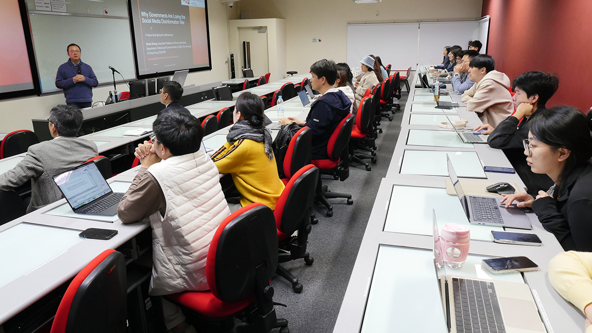 The seminar explored findings from a cross-national study conducted in Hong Kong, the Netherlands, and the United States. Prof. Zhang examined citizens' resistance to misinformation and the challenges authorities face in countering falsehoods. The study highlighted how political cynicism and conspiracy beliefs undermine corrective efforts, emphasizing the need for AI-driven interventions and media literacy to ensure information integrity. The seminar attracted around 30 PhD students and faculty members who engaged actively and contributed to a thought-provoking discussion.