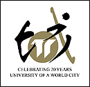 "Celebrating 20 Years: University of a World City". The logo,
