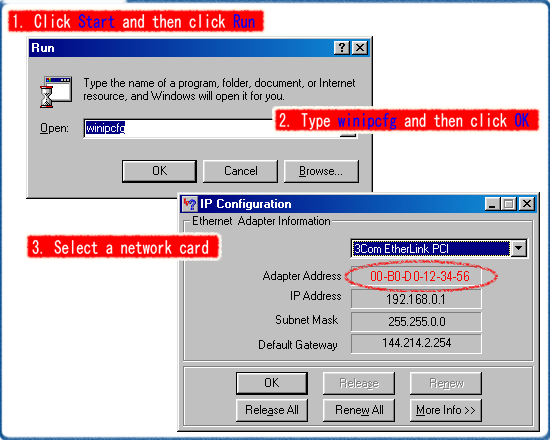 MAC address is usually printed on network card or equipment. After installing a network card into a computer, it is easy to find its MAC address out. Please click on a button for a particular operating system to show how to find it. For other network equipment or operating system, please refer to its user manual.