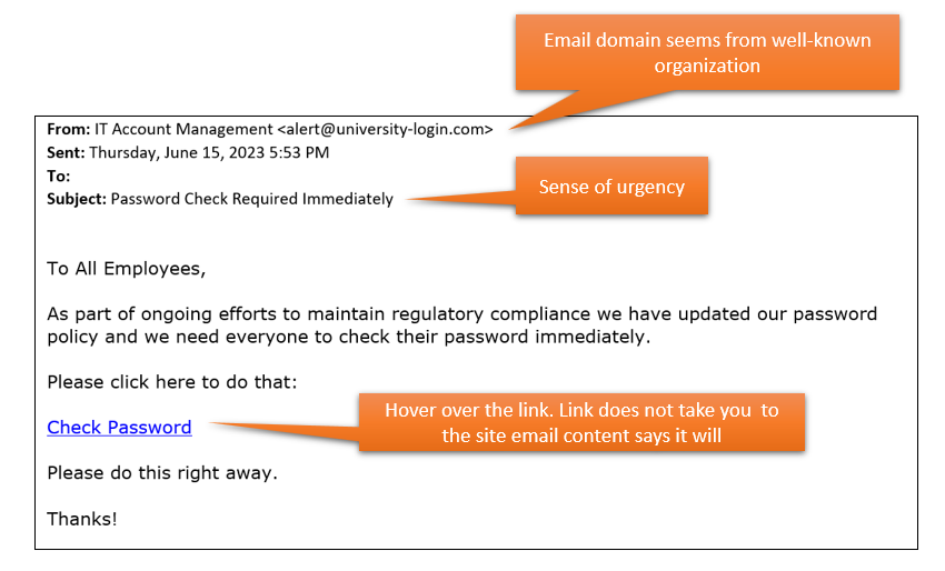 • Urgency for a demand or request (e.g. change of password, sending gift cards)