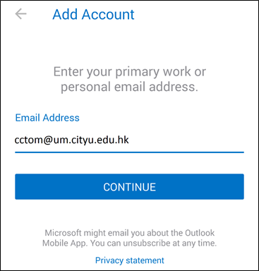 5. On the Add Account page, enter your CityUHK Staff M365 Account Username/UserID "EID@um.cityu.edu.hk" (e.g. cctom@um.cityu.edu.hk) and tap CONTINUE.