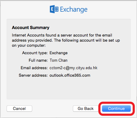 Apple Mail will try to access M365 server by your account. If the information provided is correct, this account will be set up successfully. Click Continue.