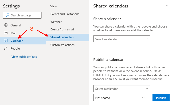 3. Click "Calendar", then "Shared calendars". Choose "Share a calendar" or "Publish a calendar" as your need.