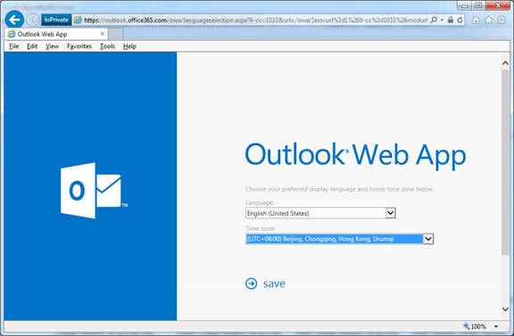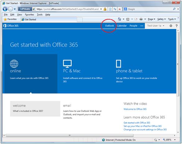 After your first time sign-in the following start-up page will be displayed, click "Outlook"