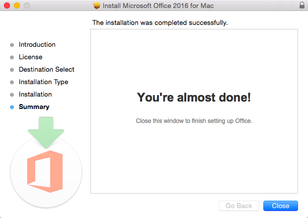 - When the installation is completed, click Close to close the dialog box and you should find Office 2016 (including Word, PowerPoint, Excel, and Outlook) in the Launch Pad and Application folder.