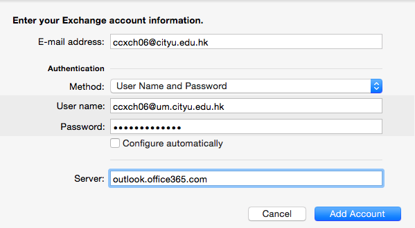 - Uncheck Configure automatically, enter the following settings, and click Add Account.
