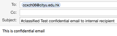 Note: When receiving confidential emails with #external keyword, CityUHK email system will decrypt it automatically prior to delivering it to your mailbox. To reply to this type of email with encryption, please make sure the keyword #external (case insensitive) is included in the email subject.