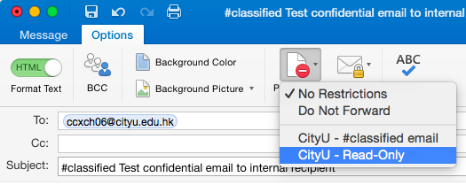 If you would like to send confidential email as read-only email (i.e. recipient(s) cannot print, edit, or forward the email), select the Options tab, click Permissions and then select CityU - Read-Only (the label #classified is optional as all read-only email is encrypted by default).