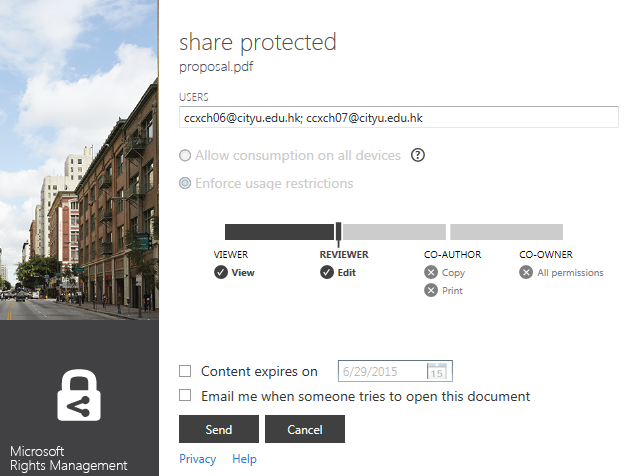 In the share protected dialog box, enter internal recipient email addresses with @cityu.edu.hk domain, specify the options that you want for this file, and then click Send.