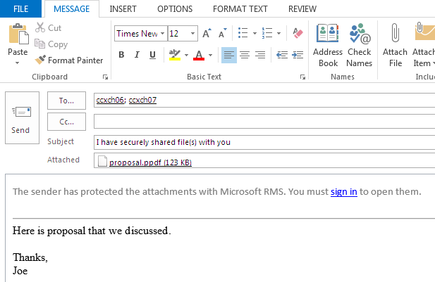 You may quickly see a dialog box to tell you that the file is being protected, and then you will see an email message is created for you that tells the recipients that the attachments are protected with Microsoft RMS.