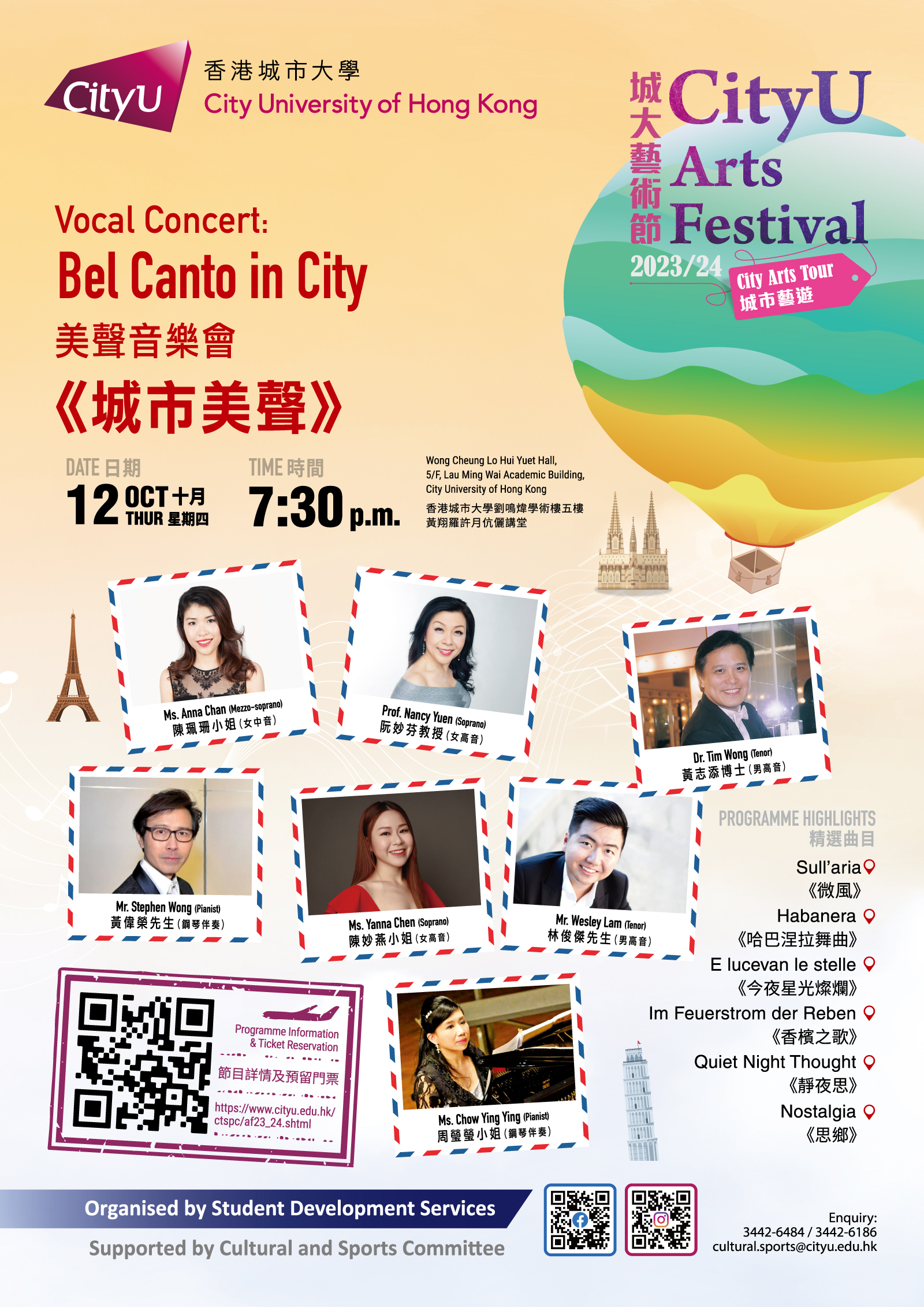 The sound of birds, wind, cars, radio, and footsteps overlap and create a harmonious city soundscape. However, a beautiful soundscape cannot be without singing. The vocal concert invites renowned vocalists to delicately interpret pieces in different languages with the Bel Canto technique derived from 17th Century Italy. Let us immerse ourselves in the beauty of Bel Canto in this bustling city. 鳥聲、風聲、車聲、廣播聲、腳步聲…… 互相交疊,製造出一片片城市聲景。美麗聲景的拼圖中不能缺少歌聲。音樂會邀請一眾著名聲樂演唱家親臨城大校園,以源於17世紀意大利的「美聲」技巧,細膩演繹不同語言的聲樂作品,讓你在這繁囂的城市裡,感受蘊藏的豐富情感,與聲樂演唱家們沈醉於這城市美聲之中!