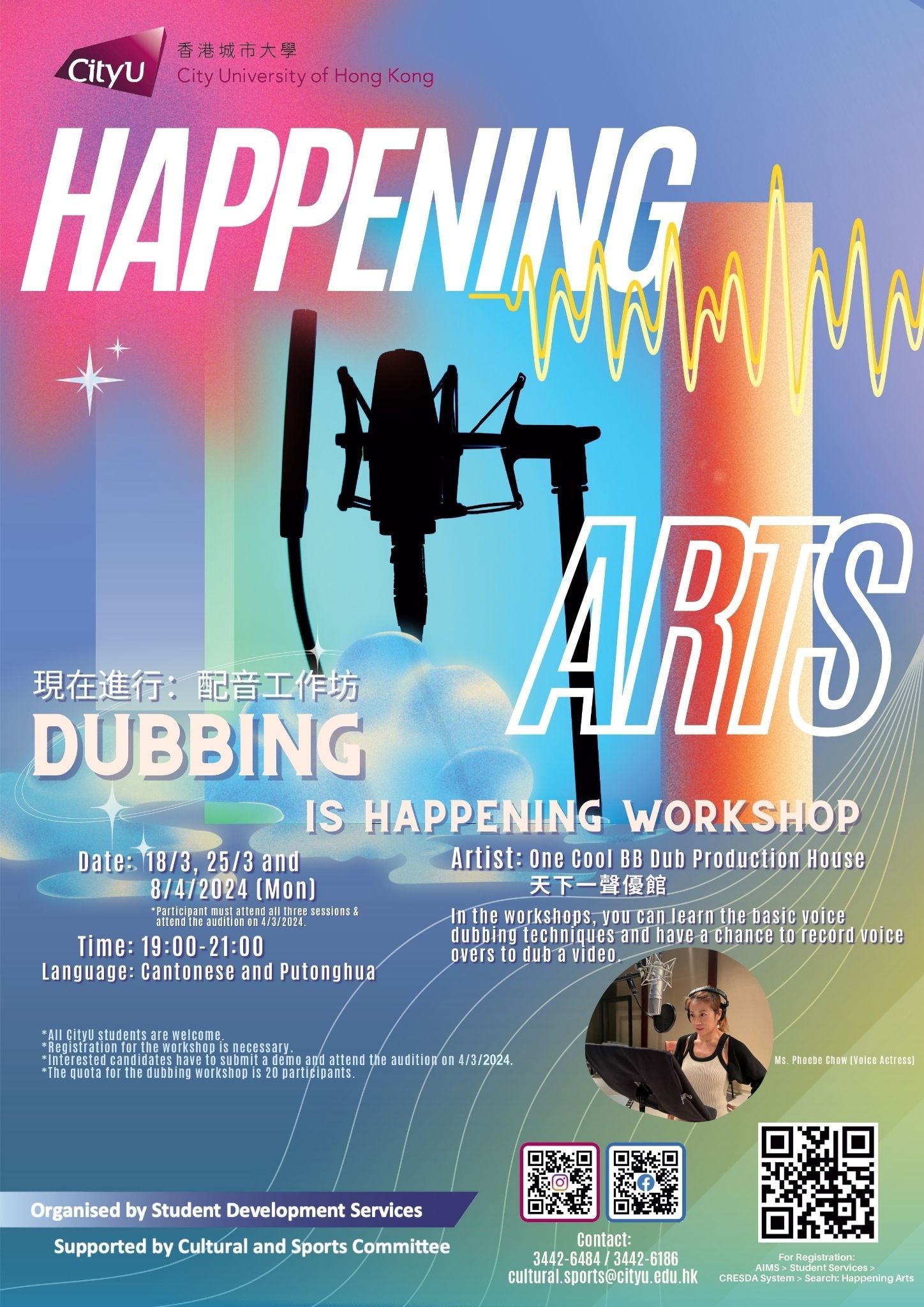 Happening Arts, an arts immersion programme to introduce a new art form and give you a first taste of arts, is returning to campus! Even if you are a newbie, you can master a new art form after joining our workshops. If you wish to challenge new art, don't hesitate to join us!