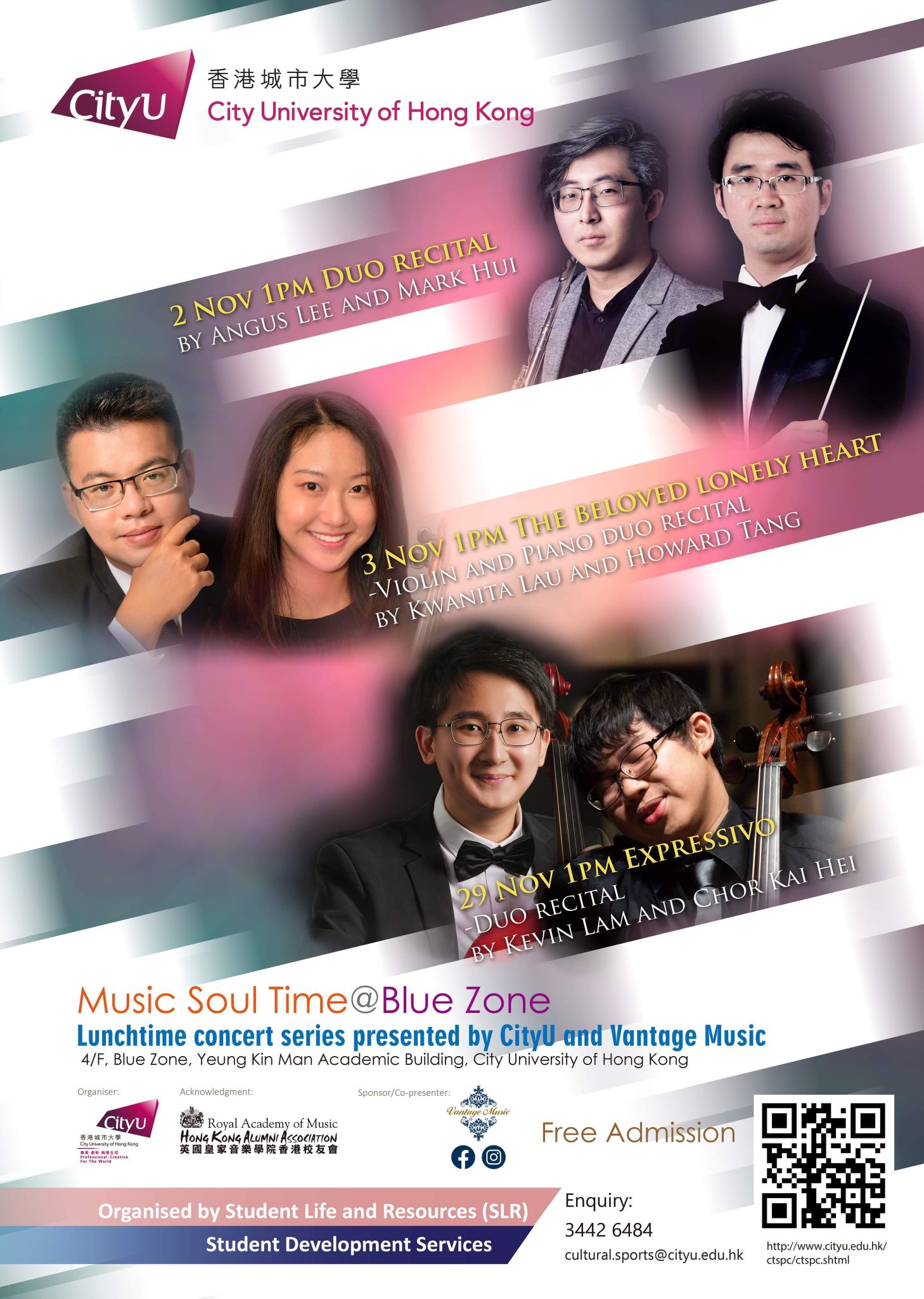 CityU is as vibrant as always, how can we lack the sound of music in our university life? Every semester we have invited outstanding Chinese and Western musicians to present lunchtime concerts at Blue Zone of the University campus. With the performers’ full devotion on the stage, the colourful ethnic Chinese Music, classical and melodious Western music, and passionate pop music float around the campus. 一向活力洋溢的城大,又怎能缺少了音樂聲呢?每個學期,我們都會邀請本地中西樂的傑出音樂家,於大學藍區演出午間音樂會。他們於臺上傾情演奏,讓充滿民族風情的中樂、 悠揚古典的西樂以及激情澎湃的流行樂曲,響遍校園處處。 |