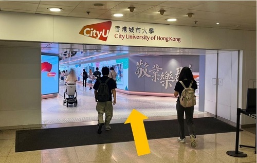 到達港鐵九龍塘站後,請往又一城商場出口走。於又一城商場內 LG1 有行人隧道連接城大校園。