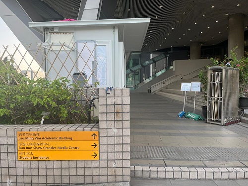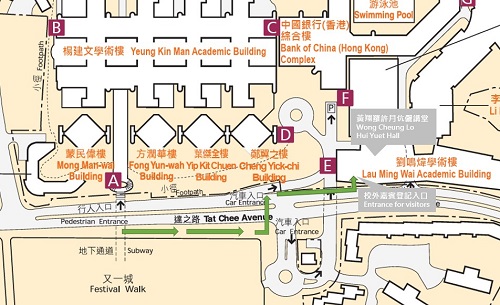 After crossing Tat Chee Avenue at the traffic light junction, follow Tat Chee Avenue's slope and go upside. You will arrive at the Lau Ming Wai Academic Building.