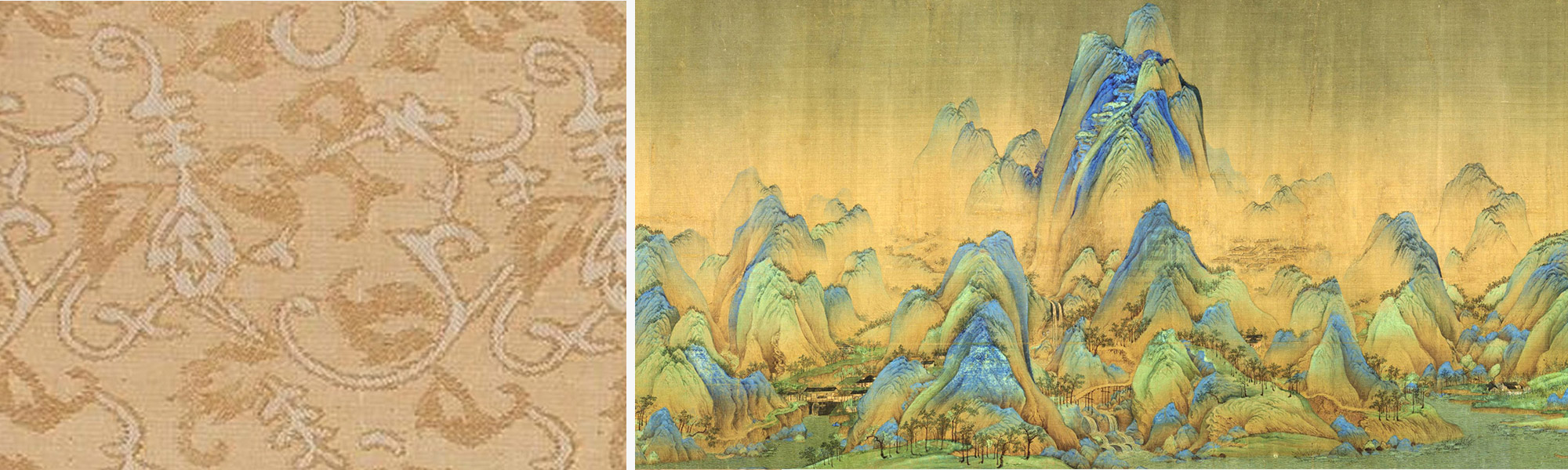 左:用作裝裱書畫的綾,多色彩淡雅,紋飾古樸,具有濃厚的中國藝術特色。