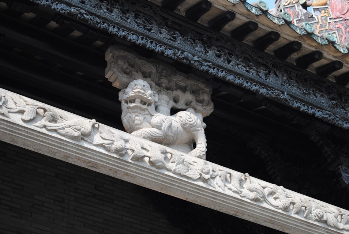 由於門廳的簷廊構成廟宇的外立面,因此它也是一處重點裝飾的地方。門廳正面明間的立柱常以石為材,而額枋亦然。看梁獅子安在額枋的中部,象徵吉祥如意,其結構作用與駝峰相同,支托上方的檁木。
