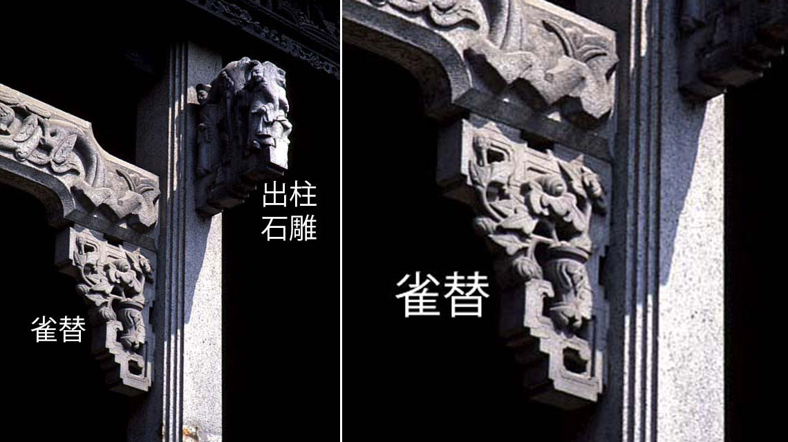 雀替是被美化了的托架,用於支承與立柱連接的額枋,常與石刻裝飾結合為一體。出柱石雕是立柱柱頭正面的一個裝飾構件,位於額枋旁邊。看梁獅子、雀替和出柱石雕三者一般同時應用,是廟宇石刻藝術的代表。