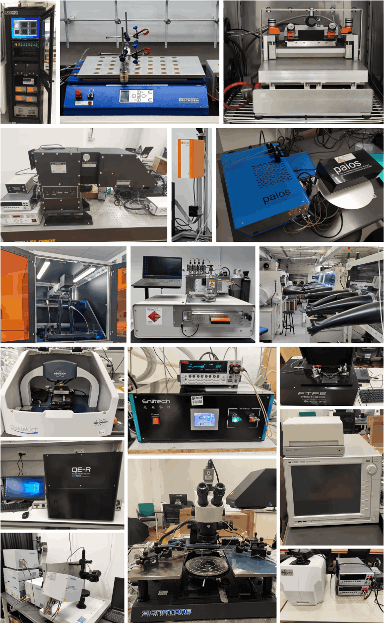 The facility includes a variety of well-equipped labs for chemical synthesis, material characterization, and thin-film processing, as well as fabrication and testing of devices such as LEDs, solar cells, transistors, photodetectors, etc., and a scale-up lab for large-area processing of thin-film devices.