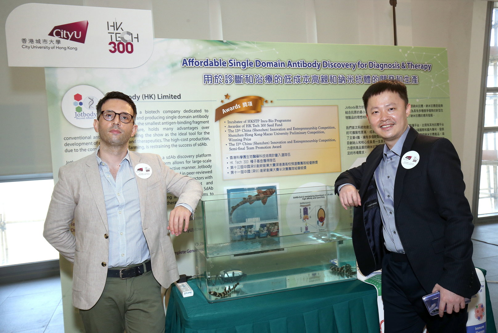Jotbody, another selected start-up, was co-founded by Professor Shi Jiahai and his student Dr Wei Likun of the Department of Biomedical Sciences at CityU. Jotbody received seed funding and angel fund investment from HK Tech 300. It specialises in developing single-domain antibodies to diagnose and treat diseases like cancer and developed a unique platform technology for preparing high-affinity nanobodies, using the immunisation of a small shark species commonly found in Hong Kong.