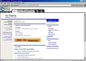 The new portal has some distinctive features: “My Pipeline”, which customizes information into three groups of users: staff, students and alumni. Each group will receive targeted messages: for example, students won't receive messages targeted to staff. “My Courses” provides a standard set of course management tools for easy communication between teachers and students, as well as a connection to WebCT and other academic resources in the Library and Computer Services. “School Services” connects to many of the University's software platforms such as the AIMS and IRIS, and other administrative services such as facilities booking. “Campus Life”, currently under construction, will provide details of sports and cultural events and will be the focus of phase two of the portal’s development.
