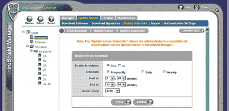 Like anti-virus software which requires the latest virus signatures to protect against new viruses, IPS also needs to update the attack signatures from time to time. This should be done automatically and transparently to the network administrator. The scheduled updates of signatures are shown in Figure 4 below.
