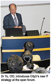 Dr Jerry Yu, Chief Information Officer (CIO), explained the decision to adopt the Blackboard Academic Suite -- Blackboard Version 6 -- as the e-Learning Platform of the University at an open forum on 5 May, with a straightforward account of the strategic e-Learning project's objective and its significance to the University community. This project forms an integral part of the University's Information Services Strategic Plan 2005-2010.