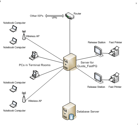 Starting from January 2009, a new printing system, equipped with better and more mature technology, includes a splendid new feature called “follow me printing” that enables submission of print jobs from any centrally managed PC or notebook computers, and picking up the printout at any printer managed by the printing system. The following figure depicts the concept: