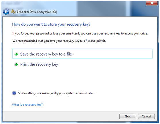 Once a password has been keyed in, the next step is to set up the recovery key, as shown in the following figure, to unlock your drive should you forget the password.
