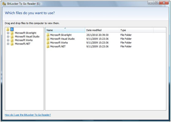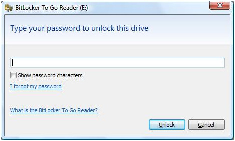 When a BitLocker To Go encrypted drive is plugged into a PC with Windows XP or Vista, you will be prompted to install the BitLocker To Go Reader, if autoPlay is enabled. After the Reader is installed, you will be prompted for the password to unlock the drive. The BitLocker To Go Reader window, which looks like Windows Explorer, appears.
