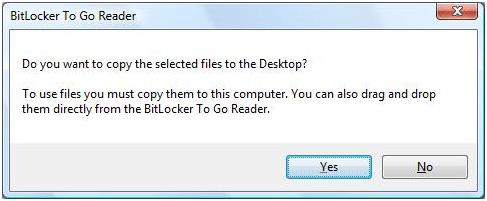 With the BitLocker To Go Reader application, you can only read files and copy them to your PC. You will encounter an error if you try to save files back to the drive because no operating system prior to Windows 7 is capable of writing to a BitLocker To Go encrypted drive. Furthermore, it is not possible to directly open any files inside the BitLocker To Go Reader, attempting to do so will bring up a pop-up window as shown below, to prompt you to copy the file to the Desktop first.