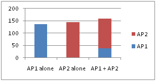In the test, two APs (AP1 and AP2) were setup to advertise different SSIDs on the same channel and two clients each was associated to one of the two APs in different scenarios (as described below). Test results were obtained by running TCP throughput tests on each client individually and both clients simultaneously for the following scenarios: when AP1 alone is turned on, when AP2 alone is turned on, and when both AP1 and AP2 are turned on. We could see that the observed improvement in channel throughput was more than 10% (from 135 Mbps to 159Mbps) when both APs are turned on implying that RF interference indeed has been avoided and channel throughout does increase even when overlapping channels are used.