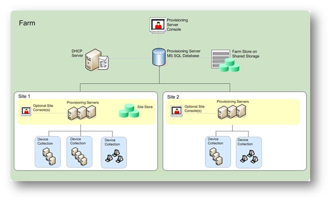 The driving force behind the system we used is the Citrix Provisioning Services (PVS) which is one of the solutions to distribute a single instance master OS image to multiple end-point clients such as our desktop Express Terminals. The journey begins with an end point client PC without a physical hard drive booting from PXE proceduresii which results in a part of or the whole OS image being loaded into RAM and the remaining parts, if any, would be stored on the virtual disk either locally or on the Citrix provisioning server. This master OS image could be securely streamed to the predefined multi-teamed clients where needed. The following is a sample site diagram of the Provisioning Server Farm: