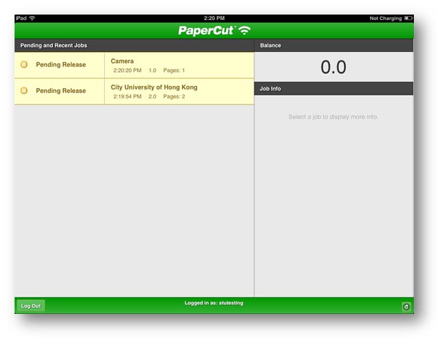 Users of iOS devices such as iPads and iPhones can send print jobs to the central print queue(s) by installing the corresponding app from our server. After installation, users can submit print jobs from their iOS devices through the apps and then release them at any of the print release stations. However, print features are limited (for example, only single-sided printing is supported) and the acceptable file types are limited by the app installed.