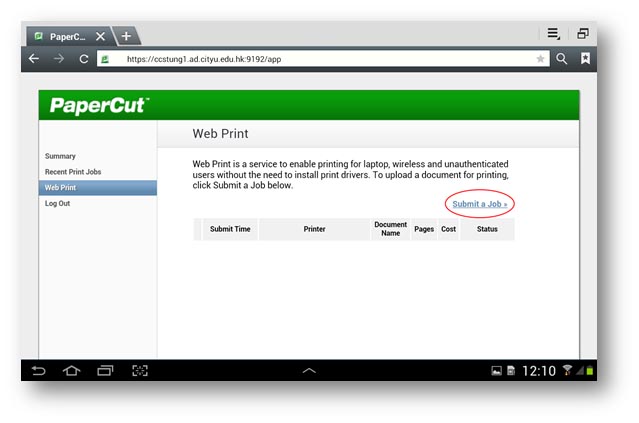 Unlike iOS devices, users of Android devices can print by submitting print jobs through the web page of the printing system and then release the print jobs at any of the print release stations. Similarly, print features are limited (only single-sided printing is supported) and only limited file types (such as PDF, Microsoft Word, Excel, and PowerPoint) are allowed to be sent to the central print queue.