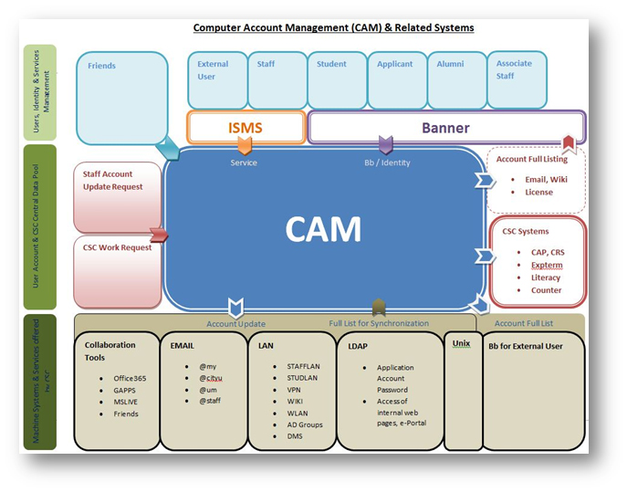 Apart from the type of users, the number of computer systems supported by CAM has been increasing over the years. Office 365, GApps, CAP and DMS are some of the new systems recently linked with CAM. The diagram below shows how CAM is linked with its related systems.