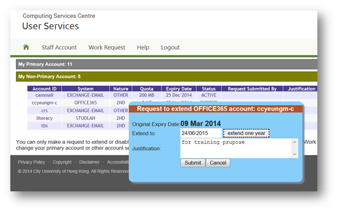 Besides creating accounts, CAM also manages the computer account life cycle. It sends notification to account owners when their accounts are due to expire. When the accounts expire, CAM will disable and then remove the accounts. To automate and speed up the staff account renewal process, a new online form has been made available on the Work Desk menu for account owners and Departmental Network Administrators (DNA) to submit their account renewal requests.