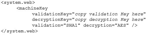 - Copy the generated “Validation key” and “Decryption key” into the <machineKey> section under <system.web> in the web.config file as shown below: