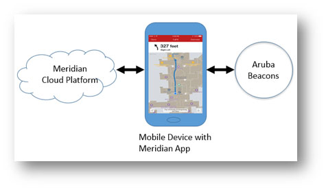 The system also provides analytics functions and management/monitoring interface of beacons. The following diagram shows the data connectivity among Meridian, mobile devices and Aruba Beacons during the trial.